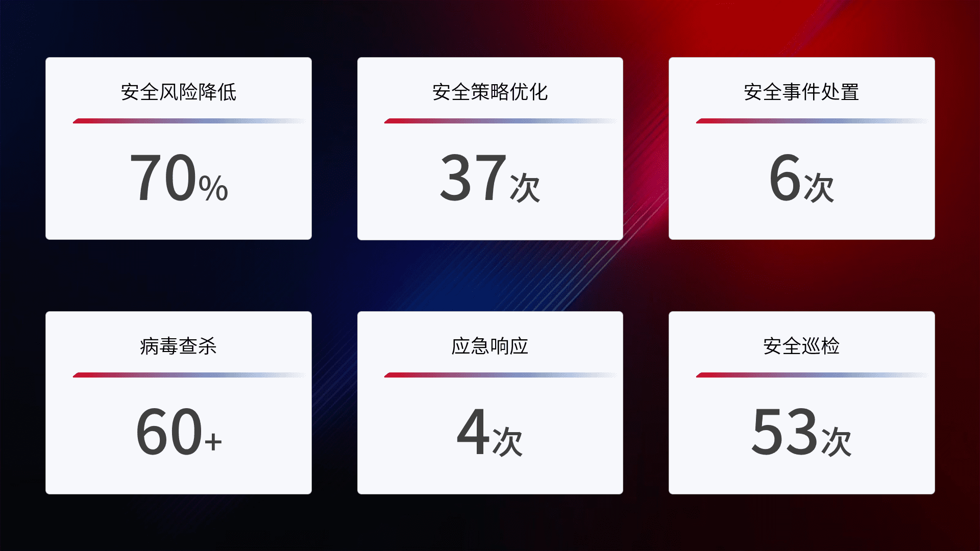 提供全面的安全事件报告体系,,,,包括处置报告、、、、周报、、季度和年度总结,,,,结合持续监控,,帮助客户深入了解网络安全状况。。。。