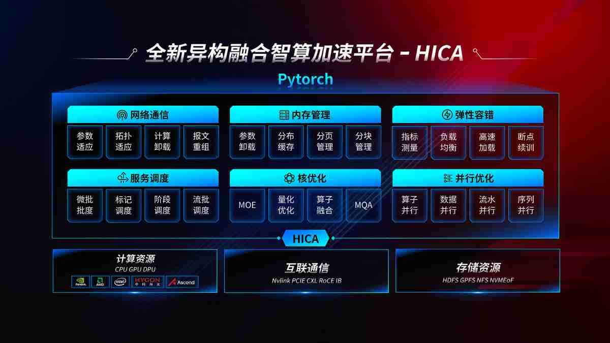 通过自研的服务层、、、中间适配层、、以及调度编排算法,,采用数据并行、、、模型并行等多种并行方式,,,把并行计算任务进行有效的分解,,使其分别由相应的软件栈和算力资源来承接。。当GPU资源变化,,HICA可以实时动态调度计算子任务并调整模型拓扑和架构,,,,以充分聚合各种算力资源。。。